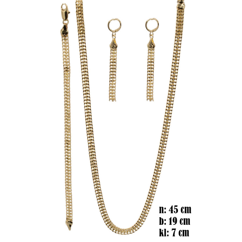 Komplet biżuterii obejmuje naszyjnik, bransoletkę oraz kolczyki, utrzymane w spójnej, złocistej kolorystyce. Charakterystyczny, drobny splot ogniw tworzy lekką, gęstą strukturę, która subtelnie odbija światło i nadaje całości elegancki, ale nienachalny wygląd. Kolczyki w formie wiszących elementów z kilku cienkich łańcuszków wprowadzają ruch i dodają kompozycji lekkości. Długość naszyjnika wynosi 45 cm, bransoletki 19 cm, a kolczyków 7 cm, co zapewnia proporcjonalne dopasowanie.