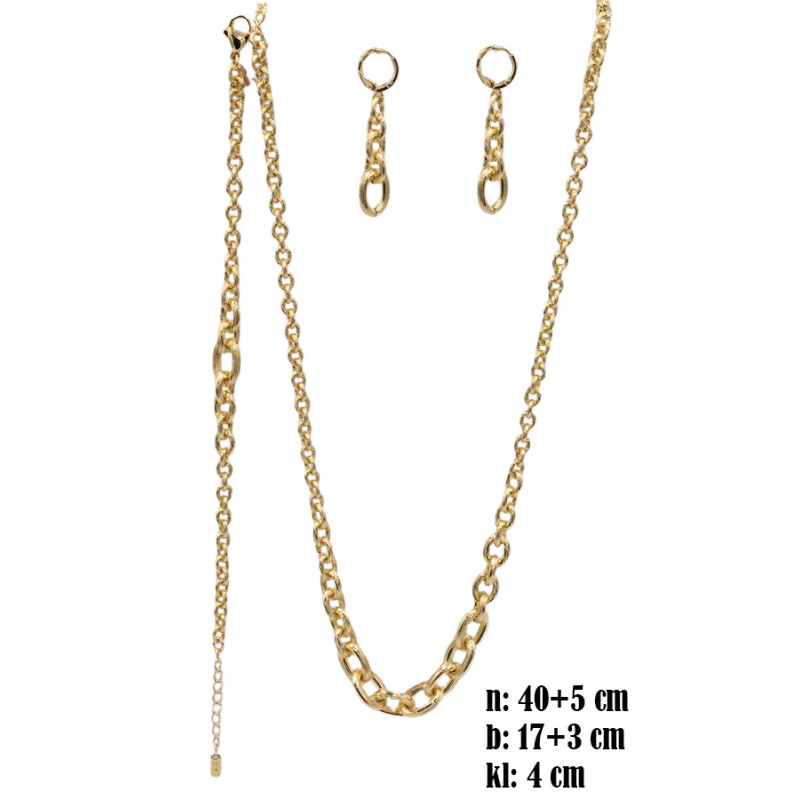 Komplet biżuterii składa się z naszyjnika, bransoletki oraz kolczyków, utrzymanych w spójnej, złocistej kolorystyce. Charakterystycznym elementem jest połączenie różnych typów ogniw – od drobniejszych, delikatnych fragmentów po większe, bardziej wyraziste ogniwa w centralnej części naszyjnika. Taki układ nadaje całości dynamicznego charakteru i przyciąga uwagę. Kolczyki o długości 4 cm subtelnie dopełniają zestaw, tworząc lekką, spójną kompozycję. Naszyjnik ma długość 40+5 cm, a bransoletka 17+3 cm, co pozwala na wygodne dopasowanie.