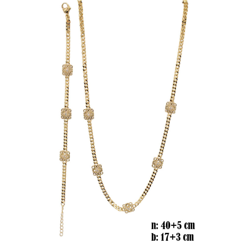 Ten komplet biżuterii obejmuje naszyjnik i bransoletkę w eleganckim, złocistym wykończeniu. Całość wyróżnia się klasycznym łańcuszkowym splotem, uzupełnionym dekoracyjnymi elementami rozmieszczonymi równomiernie na długości. Subtelne, ażurowe ozdoby nadają biżuterii bardziej wyrafinowanego charakteru, jednocześnie zachowując lekkość formy. Naszyjnik ma długość 40+5 cm, a bransoletka 17+3 cm, co pozwala na komfortowe dopasowanie.