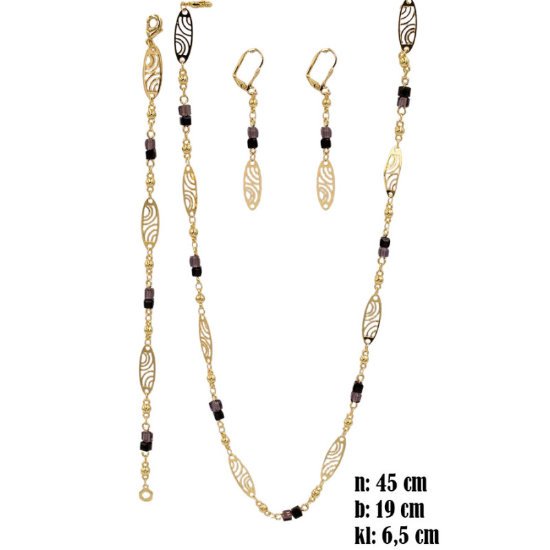 Komplet biżuterii obejmuje naszyjnik, bransoletkę oraz kolczyki, utrzymane w eleganckim, złocistym wykończeniu. Całość wyróżnia się dekoracyjnymi, ażurowymi elementami o wydłużonym kształcie, które nadają biżuterii lekkości i subtelnej finezji. Dodatkowym akcentem są drobne, ciemne koraliki, wprowadzające delikatny kontrast i podkreślające wyjątkowy charakter zestawu. Kolczyki o długości 6,5 cm stanowią wyraziste, ale nadal harmonijne uzupełnienie kompletu. Naszyjnik ma długość 45 cm, a bransoletka 19 cm.