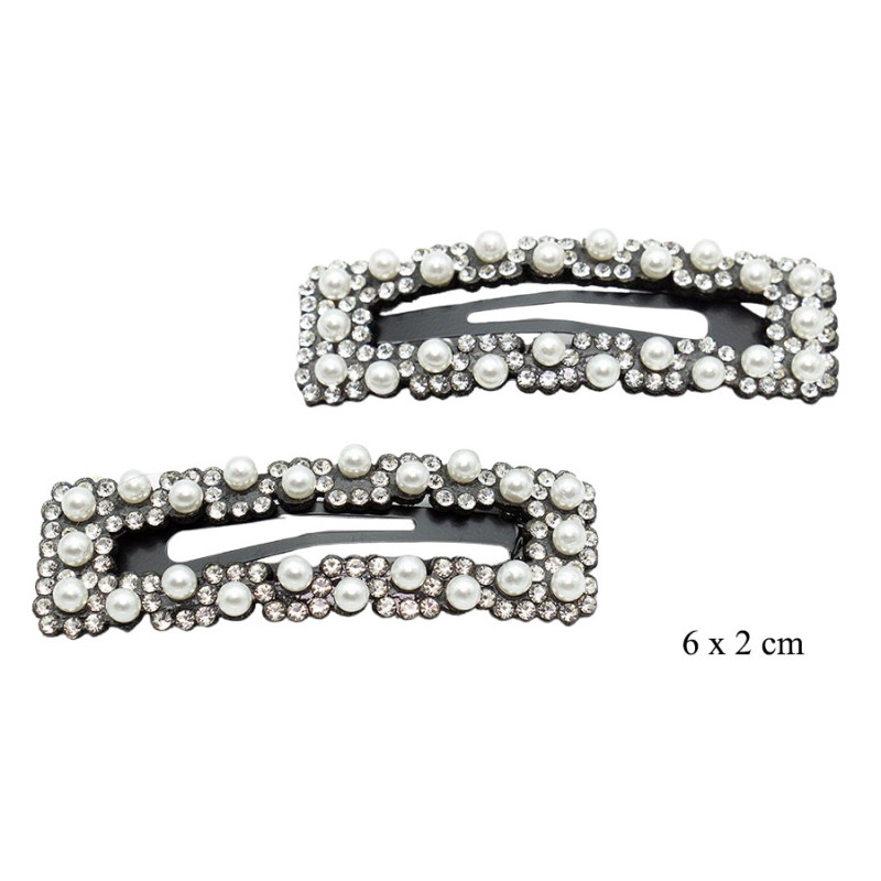 Te wyjątkowe spinki do włosów łączą klasyczną elegancję pereł z efektownym blaskiem kryształków. Prostokątny kształt oraz czarna baza podkreślają kontrast i sprawiają, że ozdoba jest wyrazista, ale nadal bardzo stylowa. Delikatne perełki rozmieszczone na całej powierzchni dodają subtelności i kobiecego charakteru.