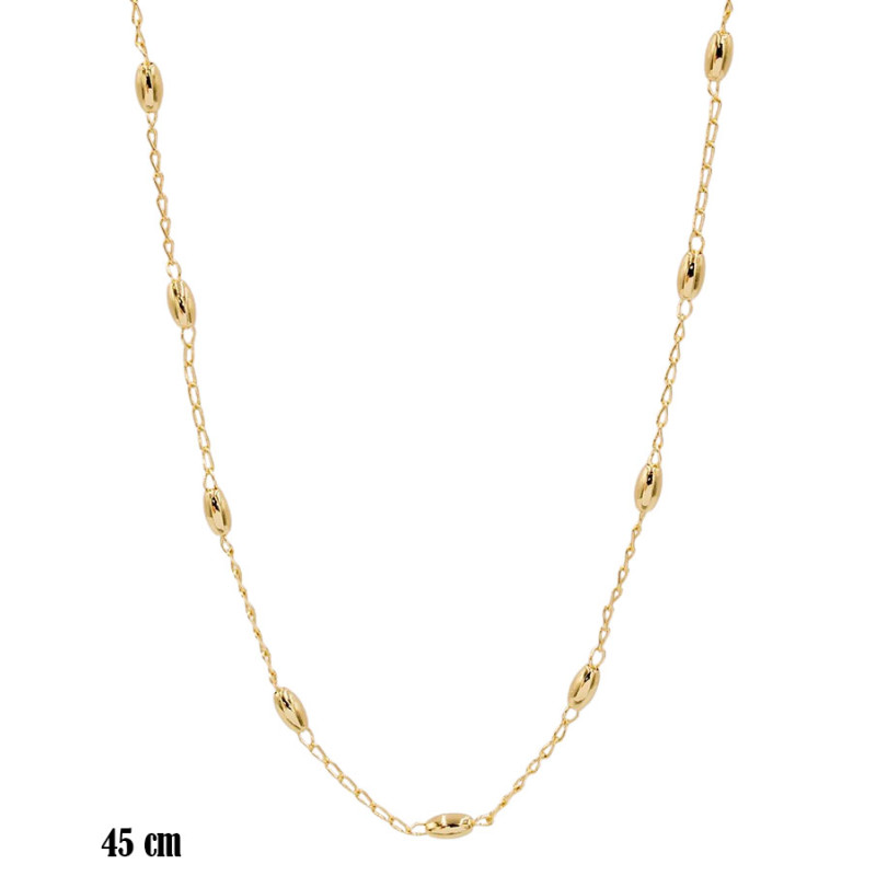 Naszyjnik w złocistym wykończeniu wyróżnia się lekką, delikatną formą, uzupełnioną o regularnie rozmieszczone, gładkie owalne elementy. Subtelny łańcuszek w połączeniu z połyskującymi detalami tworzy elegancką i nowoczesną kompozycję, która pięknie układa się na dekolcie. Długość 45 cm sprawia, że model idealnie sprawdzi się jako samodzielna ozdoba lub element stylizacji warstwowych.