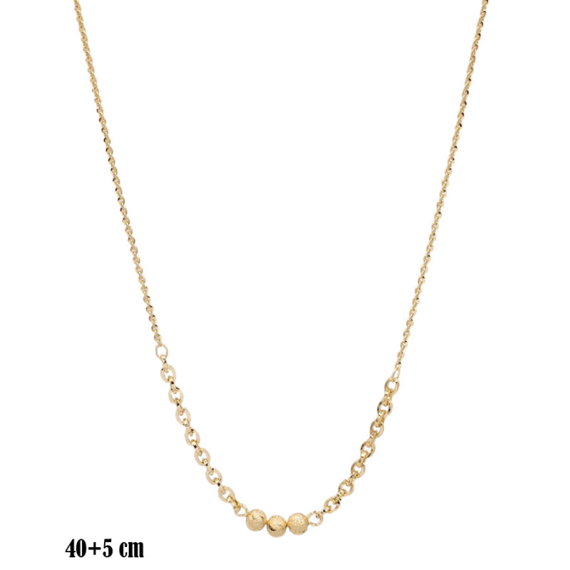 Naszyjnik w złocistym wykończeniu łączy delikatny łańcuszek z dekoracyjnym fragmentem w centralnej części. Trzy drobne, fakturowane kulki tworzą subtelny akcent, który dodaje całości elegancji i lekkości. Prosta forma sprawia, że model jest uniwersalny i łatwy do dopasowania do różnych stylizacji. Długość 40+5 cm umożliwia wygodną regulację.