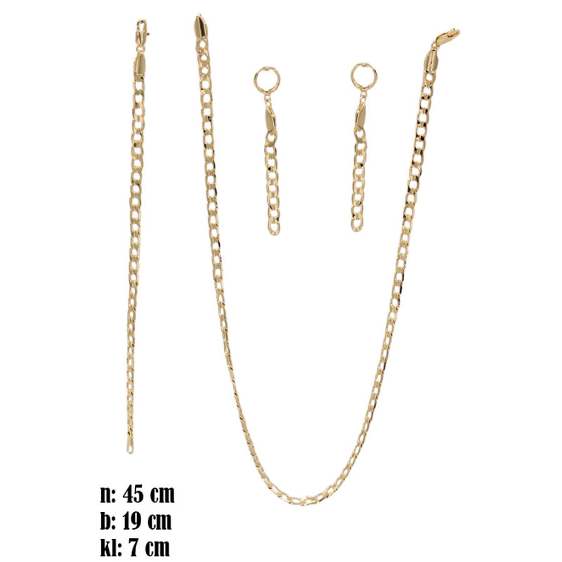 Komplet biżuterii obejmuje naszyjnik, bransoletkę oraz kolczyki, utrzymane w eleganckim, złocistym wykończeniu. Prosty, ponadczasowy splot z drobnych ogniw nadaje całości uniwersalny charakter, który sprawdzi się w wielu stylizacjach. Minimalistyczna forma została uzupełniona wydłużonymi kolczykami o długości 7 cm, które dodają lekkości i subtelnie podkreślają linię szyi. Naszyjnik ma długość 45 cm, a bransoletka 19 cm.