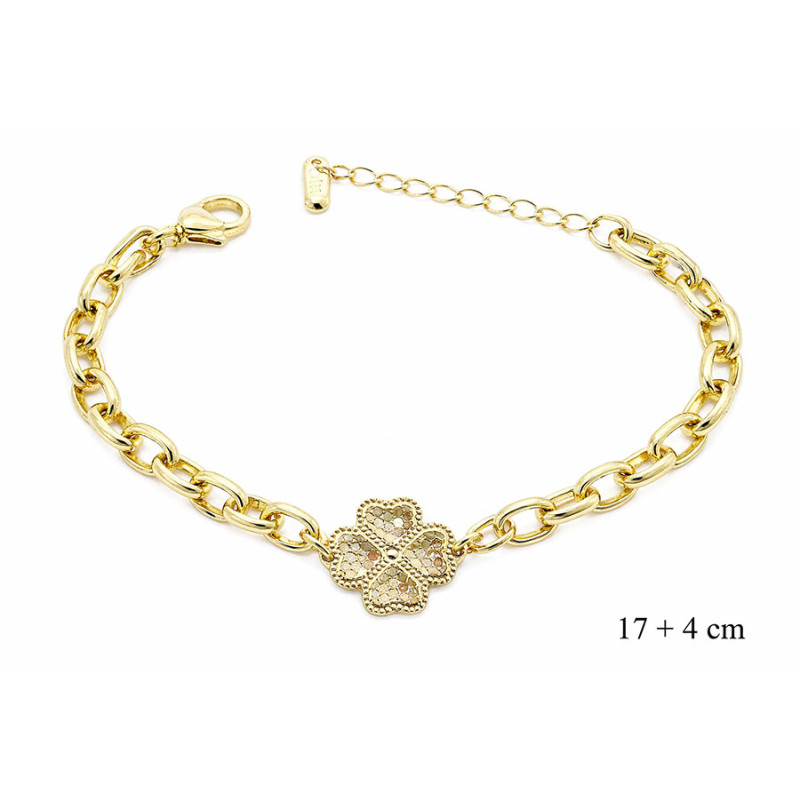 Stylowa bransoletka w złoconym wykończeniu, ozdobiona dekoracyjnym elementem w kształcie czterolistnej koniczyny – symbolem szczęścia i pomyślności. Delikatnie fakturowana powierzchnia zawieszki pięknie odbija światło, nadając biżuterii subtelny, elegancki blask.
