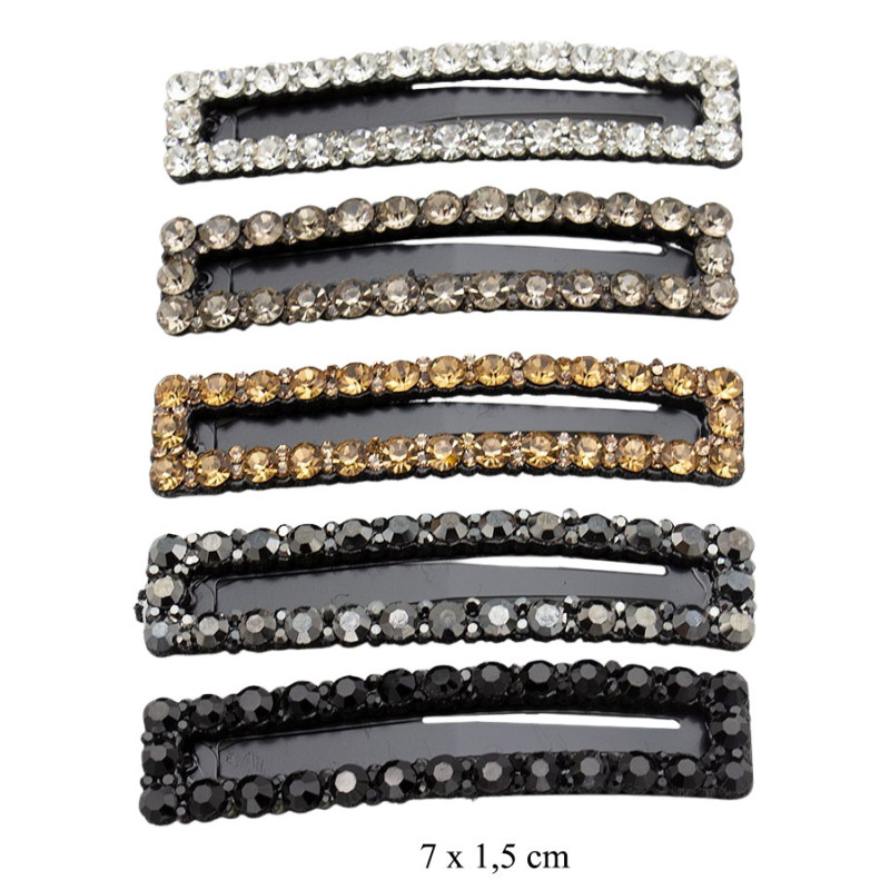 Elegancki zestaw spinek do włosów ozdobionych błyszczącymi cyrkoniami w różnych kolorach. Każda spinka ma klasyczny, prostokątny kształt i została bogato wysadzana kamieniami, które pięknie odbijają światło i dodają fryzurze efektownego blasku.