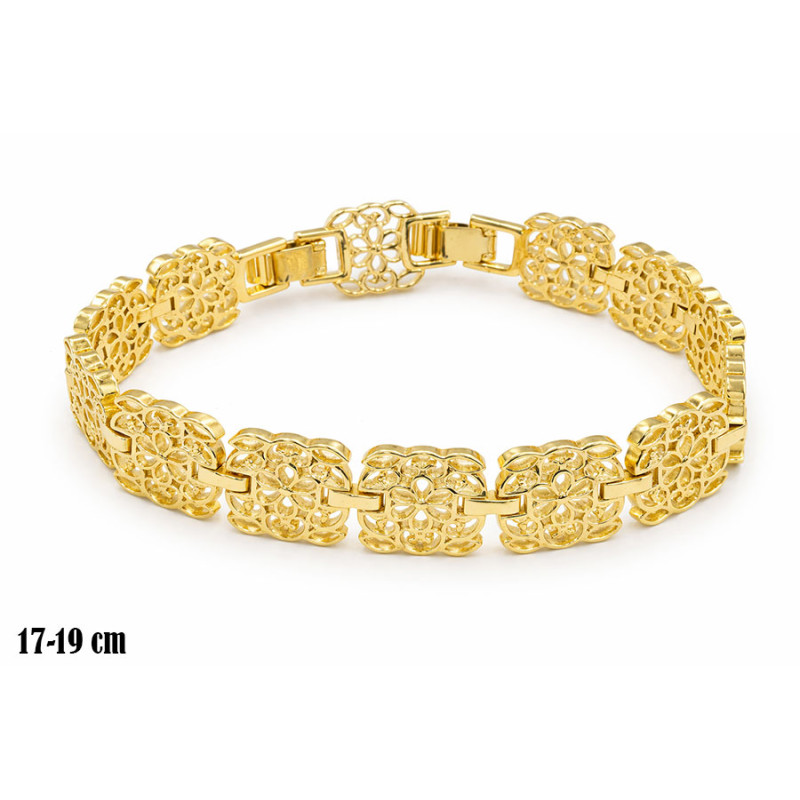 Elegancka bransoletka w złoconym wykończeniu, ozdobiona efektownymi, ażurowymi elementami w formie rozet. Misterny, koronkowy wzór nadaje biżuterii lekkości i wyjątkowego, dekoracyjnego charakteru, pięknie odbijając światło.