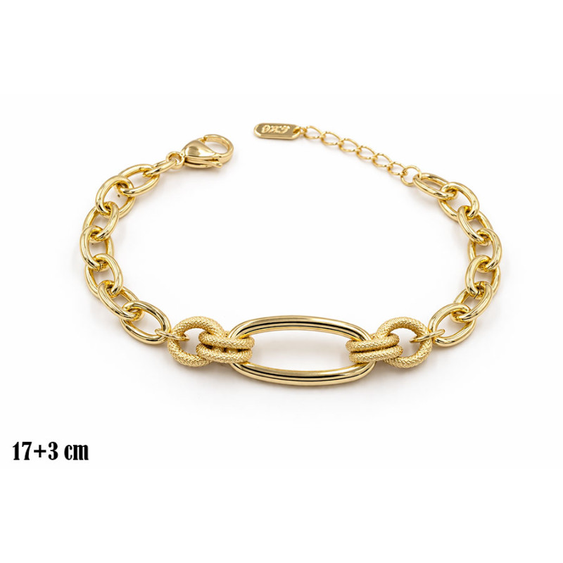 Stylowa bransoletka wykonana z pozłacanej miedzi, wyróżniająca się efektownym, centralnym ogniwem o owalnym kształcie. Połączenie klasycznego łańcuszka z dekoracyjnymi detalami tworzy nowoczesny i elegancki dodatek.