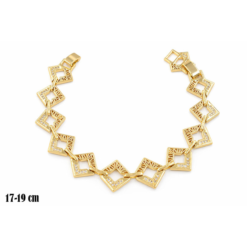 Nowoczesna bransoletka wykonana z pozłacanej miedzi, wyróżniająca się oryginalnym, geometrycznym wzorem. Ażurowe, romboidalne elementy ozdobione drobnymi cyrkoniami tworzą efektowną kompozycję pełną blasku i lekkości.