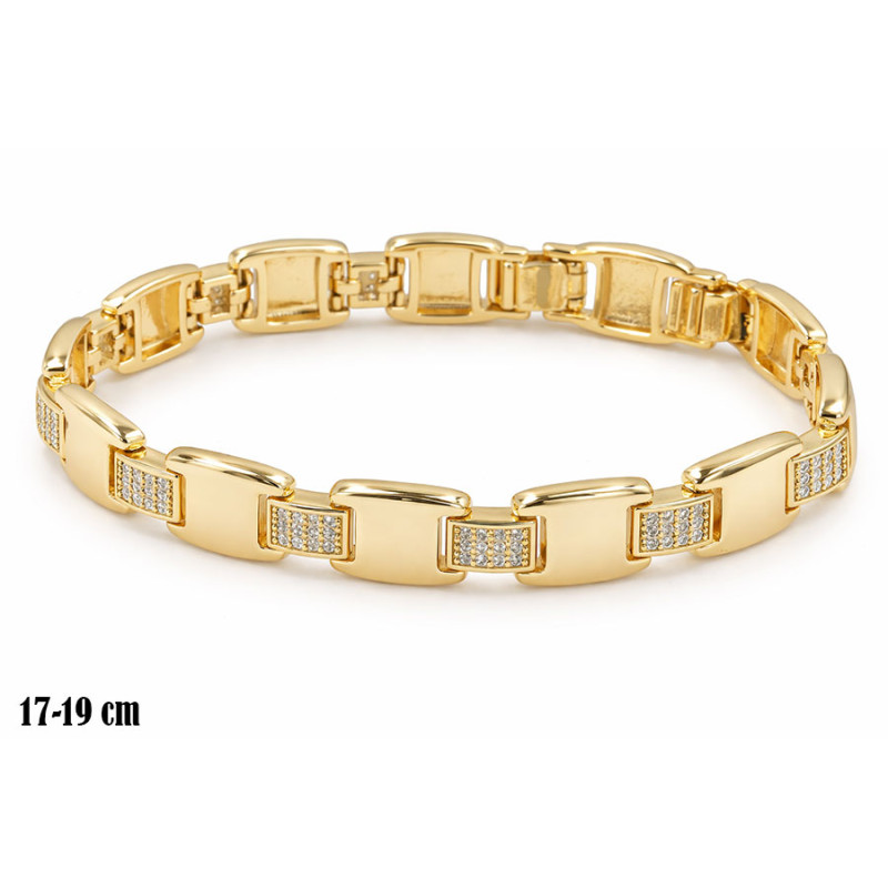 Elegancka bransoletka wykonana z pozłacanej miedzi, składająca się z masywnych, gładkich segmentów przeplatanych elementami wysadzanymi drobnymi cyrkoniami. Kontrast połyskujących powierzchni z błyszczącymi kamieniami nadaje biżuterii nowoczesnego i luksusowego charakteru.