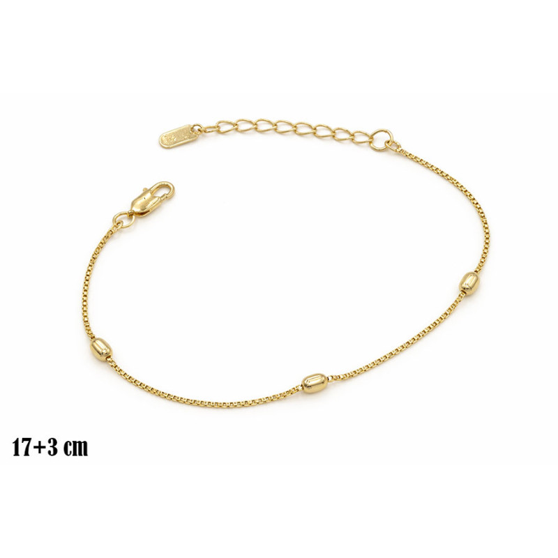 Subtelna bransoletka wykonana z pozłacanej miedzi, o cienkim łańcuszku ozdobionym minimalistycznymi, cylindrycznymi elementami. Lekka i elegancka forma sprawia, że biżuteria pięknie prezentuje się na nadgarstku, dodając stylizacji delikatnego blasku.