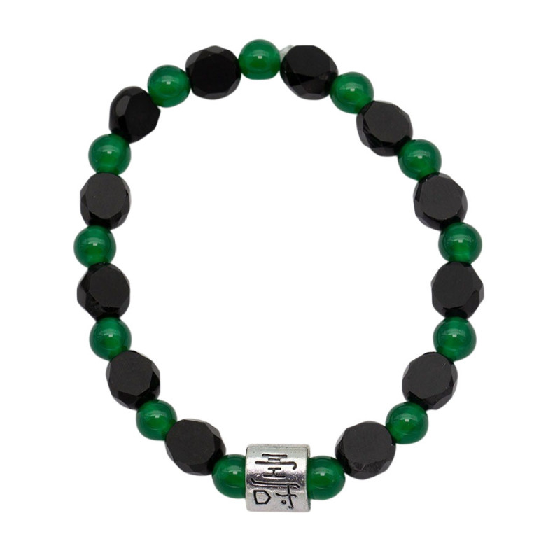 Elegancka bransoletka wykonana z naturalnych kamieni, łącząca głęboką zieleń malachitu z połyskującą czernią fasetowanych kryształów. Centralnym elementem jest metalowy koralik z subtelnym grawerem, który nadaje całości wyjątkowego charakteru.