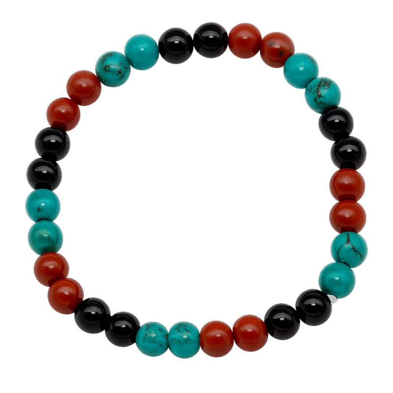 Wyjątkowa bransoletka wykonana z naturalnych kamieni w trzech kontrastujących kolorach: turkusowym, czerwonym i czarnym. Harmonijne połączenie barw nadaje jej oryginalny, energetyczny charakter i sprawia, że przyciąga uwagę.