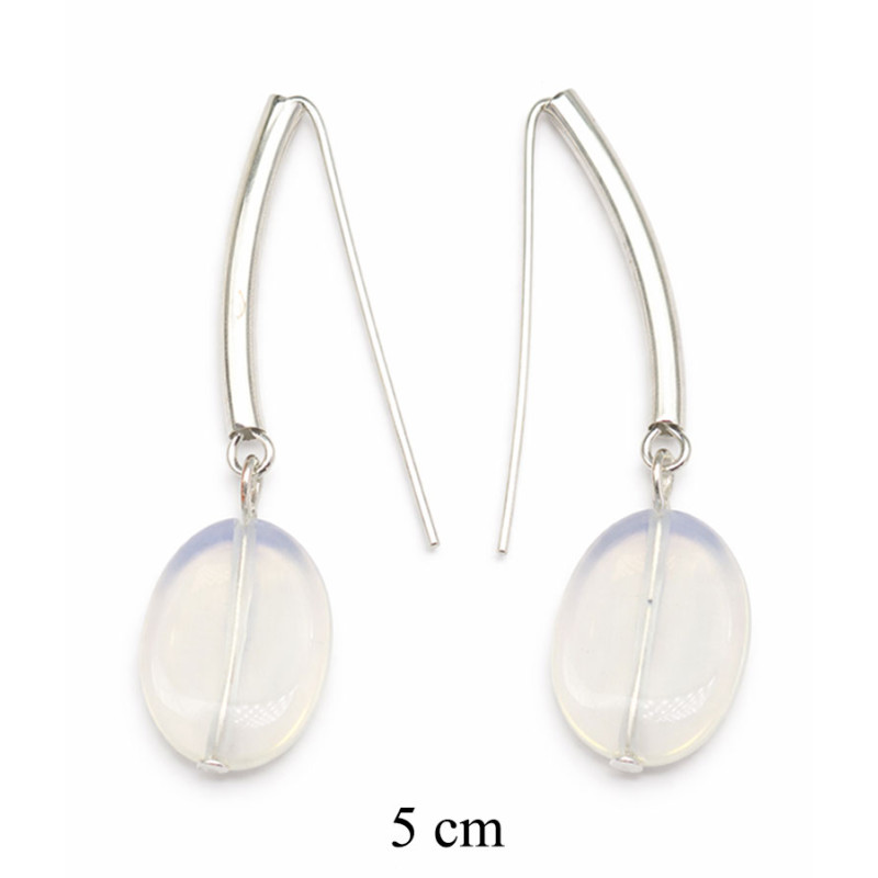 Eleganckie kolczyki z kamieniem typu opalit, wyróżniające się subtelnym, mlecznym kolorem z delikatnym, tęczowym połyskiem. Owalne kamienie zostały zawieszone na nowoczesnych, wydłużonych biglach w kolorze srebrnym, co nadaje całości lekkości i minimalistycznego charakteru.
