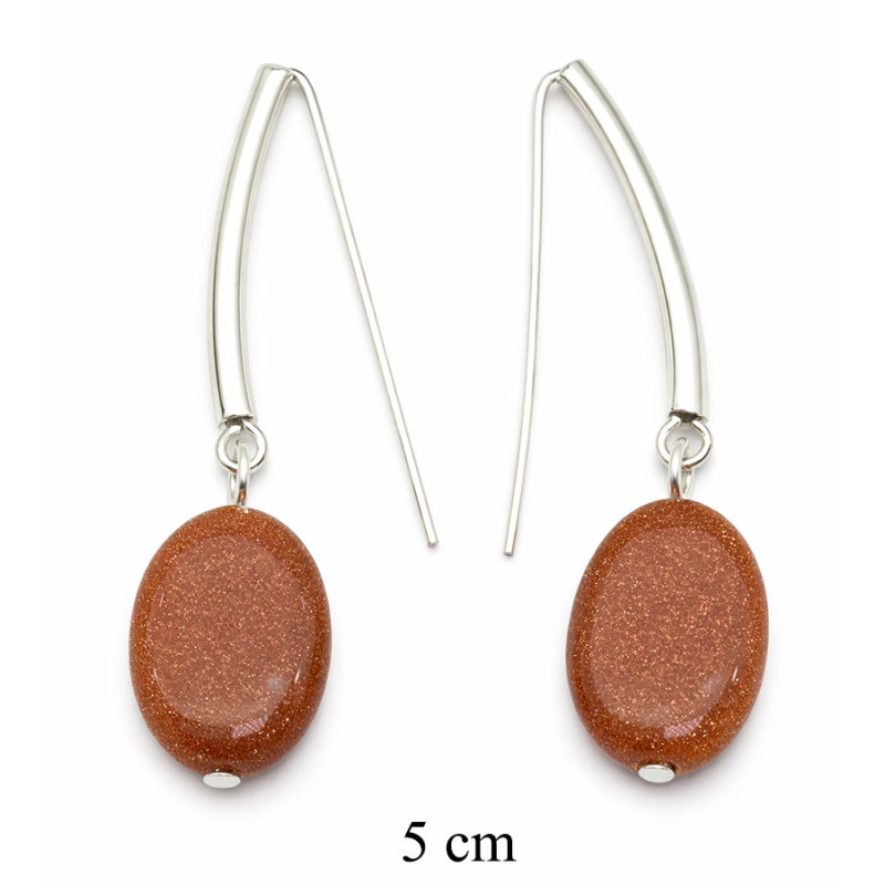 Eleganckie kolczyki wykonane z kamienia typu „piasek pustyni”, który zachwyca drobnym, brokatowym połyskiem w ciepłym, brązowym odcieniu. Owalne elementy zostały zawieszone na nowoczesnych, wydłużonych biglach w kolorze srebrnym, co nadaje całości lekkości i stylowego charakteru.