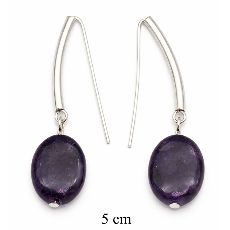 Eleganckie kolczyki z naturalnym ametystem w głębokim, fioletowym odcieniu. Owalne kamienie o subtelnym połysku zostały zawieszone na nowoczesnych, wydłużonych biglach w kolorze srebrnym, co nadaje całości lekkości i wyrafinowanego charakteru.