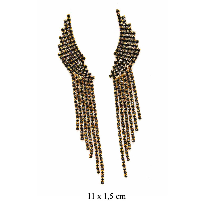 Wyraziste kolczyki w efektownym połączeniu czerni i złota, zdobione licznymi, połyskującymi kryształkami. Kaskadowa forma z długimi, ruchomymi łańcuszkami nadaje im dynamicznego charakteru i pięknie odbija światło przy każdym ruchu.