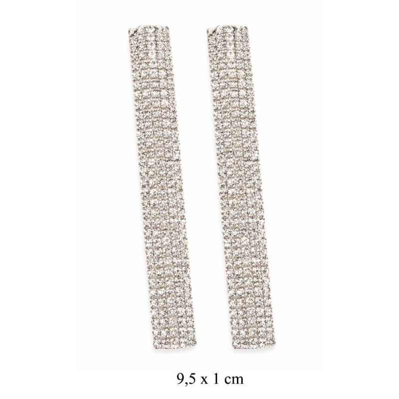 Eleganckie kolczyki w formie prostych, wydłużonych pasków, w całości wysadzane drobnymi, lśniącymi kryształkami. Minimalistyczna, a zarazem efektowna forma sprawia, że pięknie odbijają światło i dodają stylizacji wyjątkowego blasku.