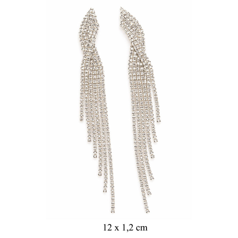 Zjawiskowe kolczyki o wydłużonej, kaskadowej formie, w całości zdobione lśniącymi kryształkami. Delikatnie opadające łańcuszki tworzą efekt lekkości i ruchu, pięknie odbijając światło przy każdym kroku.