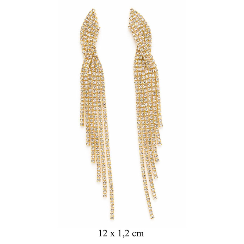 Efektowne kolczyki o wydłużonej, kaskadowej formie, zdobione licznymi, błyszczącymi kryształkami. Złote wykończenie podkreśla ich luksusowy charakter, a delikatnie opadające łańcuszki tworzą piękny efekt ruchu i światła.