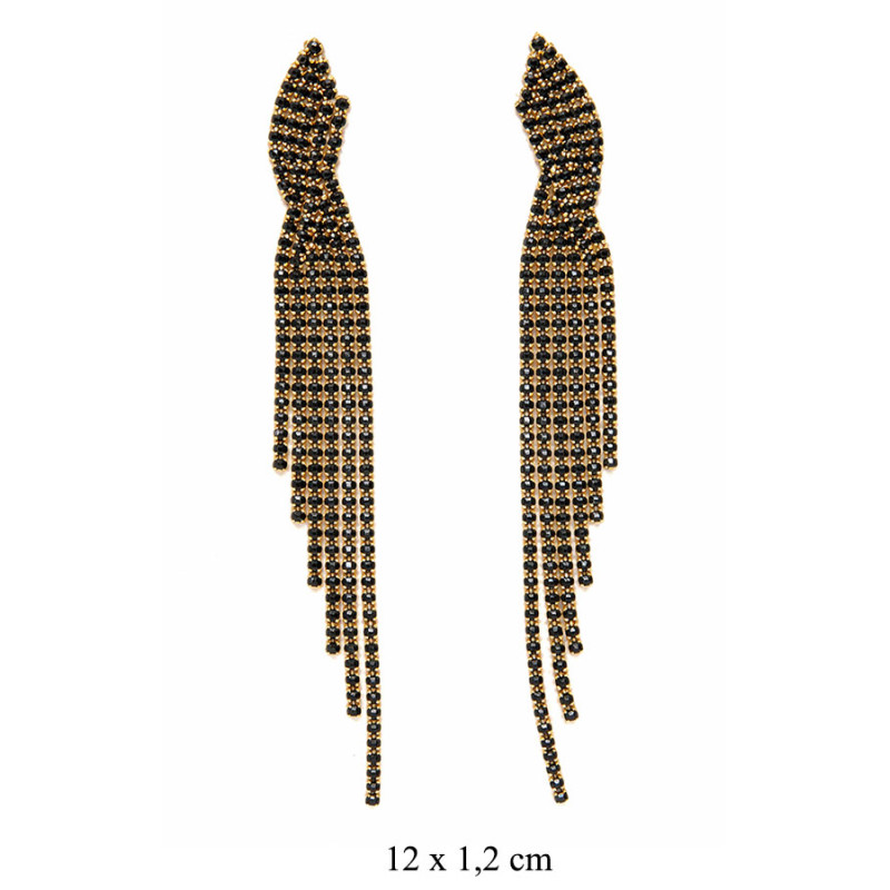 Zjawiskowe kolczyki o wydłużonej, kaskadowej formie, zdobione czarnymi kryształkami osadzonymi w złotym wykończeniu. Kontrast czerni i złota nadaje im eleganckiego, wyrazistego charakteru, a delikatnie opadające łańcuszki tworzą efekt pięknego ruchu i subtelnego blasku.