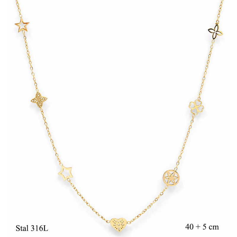 Delikatny, złoty naszyjnik ozdobiony różnorodnymi zawieszkami, takimi jak gwiazdki, koniczynki i subtelne ażurowe wzory. Całość tworzy lekką, harmonijną kompozycję pełną symboliki i kobiecego uroku.