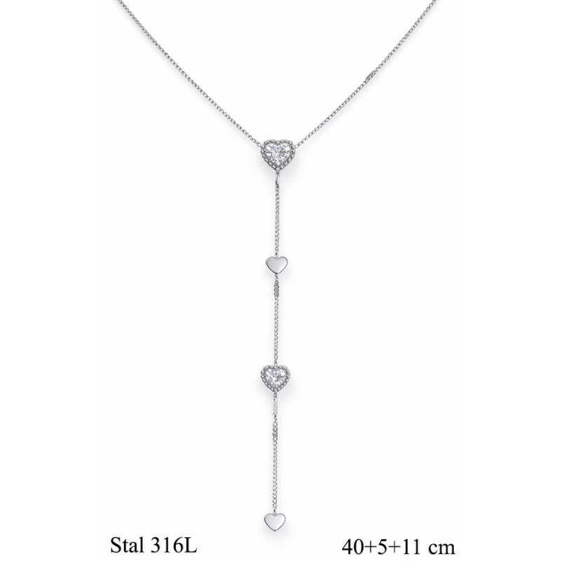 Elegancki naszyjnik typu krawatka w srebrnym kolorze, ozdobiony romantycznymi motywami serc. Górna część przyciąga uwagę większym sercem z cyrkonią, a pionowo opadający łańcuszek zakończony jest kolejnymi subtelnymi elementami, tworząc efektowną i kobiecą kompozycję.