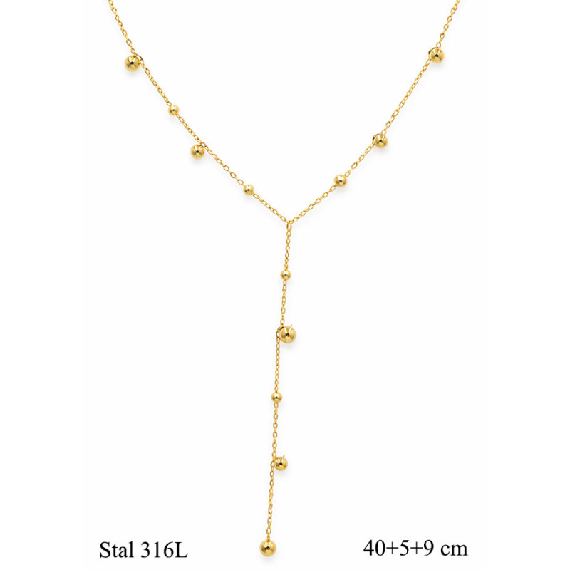 Subtelny naszyjnik o wydłużonej formie przyciąga uwagę lekką, kaskadową konstrukcją. Cienki łańcuszek w złotym kolorze zdobią drobne, gładkie kulki rozmieszczone w regularnych odstępach. Centralna część opada pionowo, tworząc efekt eleganckiego przedłużenia dekoltu. Całość prezentuje się lekko i harmonijnie, dzięki czemu biżuteria dobrze układa się na szyi. Długość naszyjnika wynosi 40+5+9 cm, co pozwala dopasować go do różnych stylizacji i wysokości dekoltu.