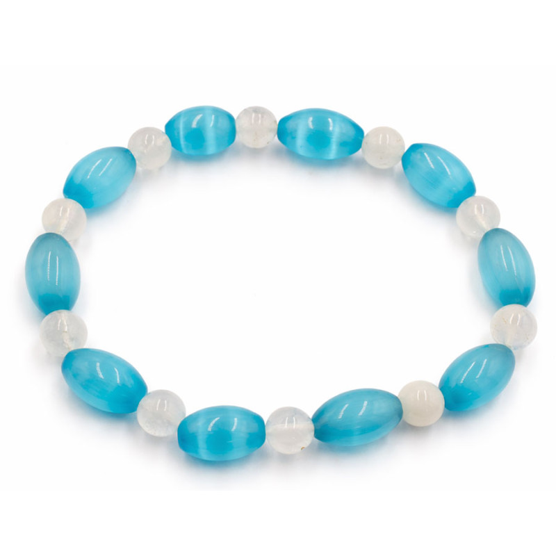 Bransoletka wyróżnia się lekką, kolorystyczną formą opartą na zestawieniu podłużnych koralików w intensywnym, turkusowym odcieniu z drobnymi, kulistymi elementami w mlecznej bieli. Gładka powierzchnia większych koralików subtelnie odbija światło, a półtransparentne, jasne akcenty wprowadzają delikatny kontrast. Całość układa się w rytmiczny, harmonijny wzór, który przyciąga wzrok, ale pozostaje wyważony i łatwy w stylizacji. Elastyczna konstrukcja sprawia, że bransoletka dobrze dopasowuje się do nadgarstka.