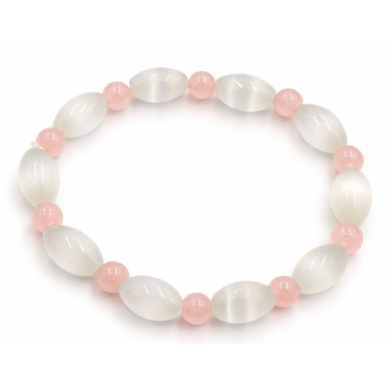 Bransoletka zachwyca subtelnym połączeniem jasnych, półtransparentnych koralików w mlecznym odcieniu z drobnymi, kulistymi elementami w delikatnym różu. Podłużne formy przeplatają się z mniejszymi akcentami, tworząc spokojny, rytmiczny układ. Gładka powierzchnia koralików miękko odbija światło, dzięki czemu całość prezentuje się lekko i elegancko. Stonowana kolorystyka sprawia, że bransoletka wygląda naturalnie na nadgarstku i łatwo dopasowuje się do różnych stylizacji.