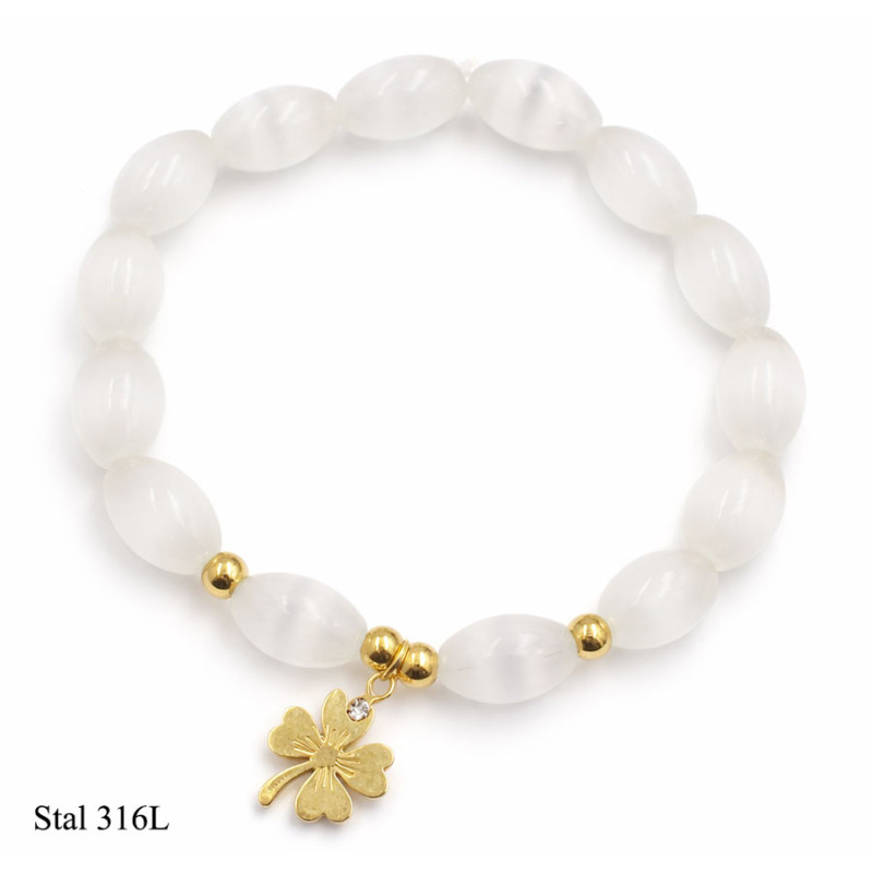 Bransoletka wyróżnia się spokojną, jasną kolorystyką i delikatnym detalem dekoracyjnym. Podłużne, półtransparentne koraliki w mlecznym odcieniu tworzą spójną, lekką formę, która miękko układa się na nadgarstku. Całość uzupełniają niewielkie, złote kuleczki oraz zawieszka w kształcie czterolistnej koniczyny z drobnym, połyskującym elementem. Ten akcent przyciąga uwagę i nadaje kompozycji wyrazistości, zachowując jednocześnie subtelny charakter.