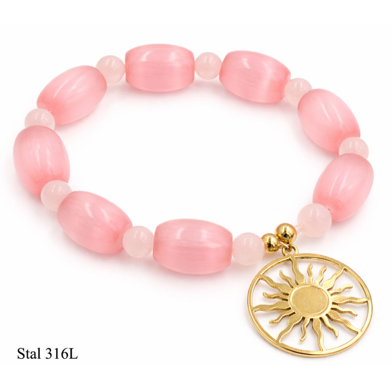 Bransoletka przyciąga uwagę miękką, pastelową kolorystyką i wyraźnym detalem ozdobnym. Podłużne koraliki w odcieniu pudrowego różu przeplatają się z drobnymi, jaśniejszymi elementami, tworząc harmonijną, lekką kompozycję. Gładka powierzchnia koralików delikatnie odbija światło, co podkreśla subtelny charakter całości. Centralnym punktem jest zawieszka w kształcie słońca w złotym kolorze, która dodaje wyrazistości i stanowi efektowne uzupełnienie formy.