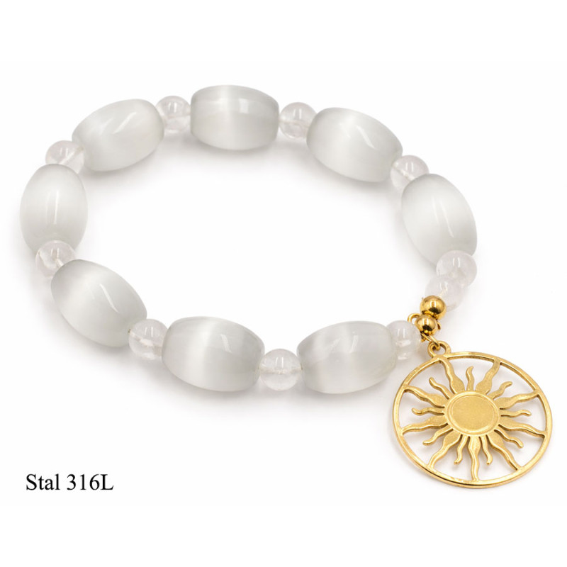 Bransoletka zachwyca stonowaną, jasną kolorystyką i wyważoną formą. Podłużne koraliki w mlecznym, półtransparentnym odcieniu przeplatają się z drobnymi, kulistymi elementami, tworząc spokojny i harmonijny układ. Gładka powierzchnia koralików delikatnie rozprasza światło, nadając całości miękkiego, subtelnego połysku. Wyrazistym akcentem jest zawieszka w kształcie słońca w złotym kolorze, która przyciąga uwagę i przełamuje minimalistyczny charakter kompozycji.