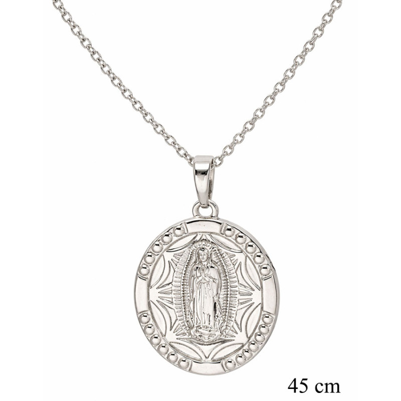 Elegancki naszyjnik z okrągłym medalikiem przedstawiającym wizerunek Matki Boskiej. To klasyczny symbol wiary, ochrony i duchowego wsparcia, który doskonale sprawdzi się jako codzienny talizman.