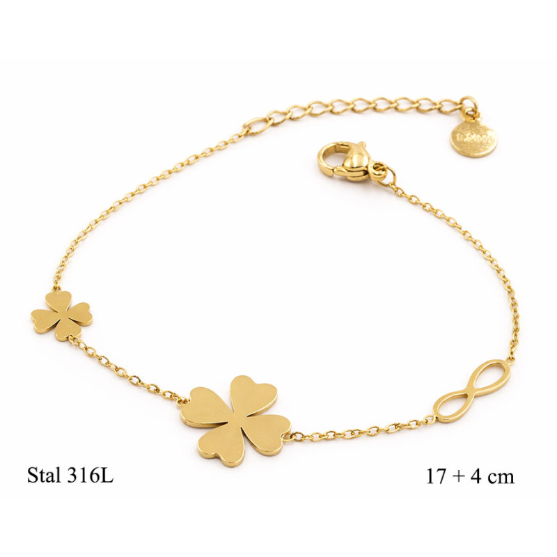 Delikatna i symboliczna bransoletka wykonana ze stali nierdzewnej 316L w złotym kolorze. Połączenie motywu czterolistnej koniczynki oraz znaku nieskończoności tworzy wyjątkową biżuterię niosącą pozytywne znaczenie – szczęście i trwałość.