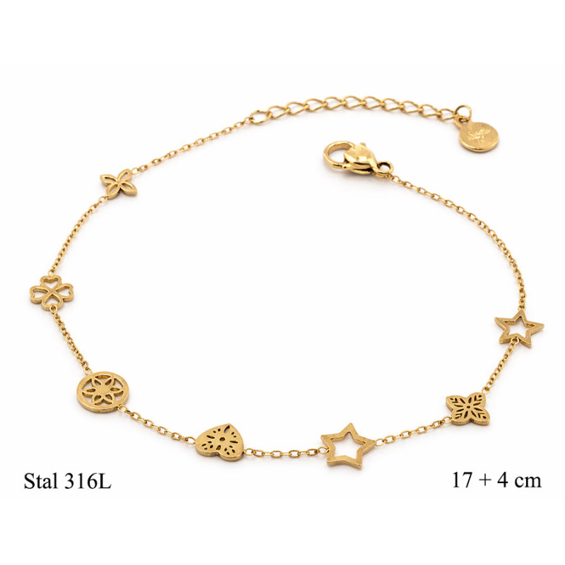 Subtelna i stylowa bransoletka wykonana ze stali nierdzewnej 316L w złotym kolorze. Ozdobiona różnorodnymi zawieszkami o ażurowym wykończeniu, które nadają jej lekkości i wyjątkowego charakteru.