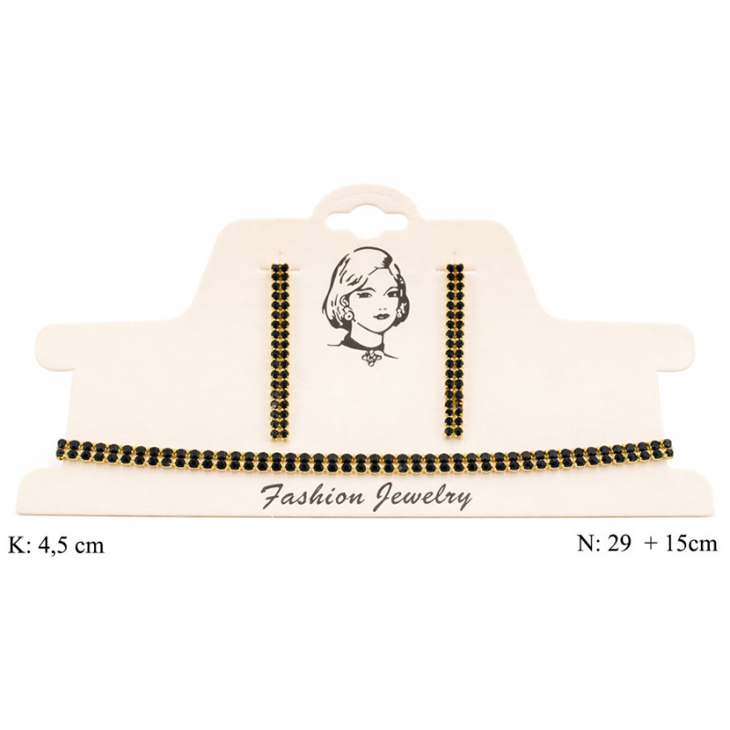 Stylowy komplet biżuterii składający się z naszyjnika i kolczyków, ozdobionych czarnymi, błyszczącymi kryształkami. To doskonały wybór dla kobiet, które cenią wyraziste dodatki i ponadczasową elegancję.