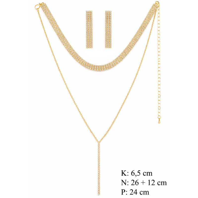 Elegancki komplet biżuterii w złotym kolorze, ozdobiony błyszczącymi kryształkami, to idealna propozycja dla kobiet ceniących klasykę w luksusowym wydaniu. Warstwowy naszyjnik z efektownym, wiszącym elementem typu „Y” pięknie podkreśla dekolt i dodaje stylizacji wyrafinowania.