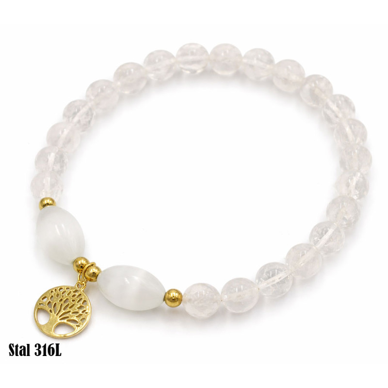 Delikatna i stylowa bransoletka wykonana z jasnych, półtransparentnych kamieni to idealna propozycja dla miłośniczek subtelnej biżuterii. Uzupełniona złotymi elementami ze stali chirurgicznej oraz zawieszką drzewa życia, symbolizuje harmonię, siłę i równowagę.