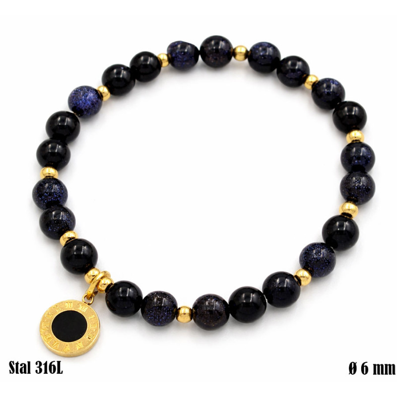 Stylowa bransoletka łącząca klasyczną czerń z głębokim, granatowym połyskiem kamieni (typu noc Kairu) to doskonały wybór dla osób ceniących elegancję z nutą oryginalności. Subtelne złote przekładki ze stali chirurgicznej oraz okrągła zawieszka dodają całości luksusowego charakteru.