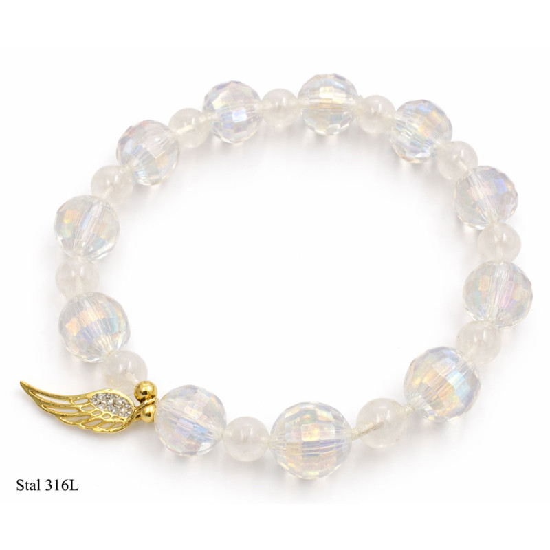 Delikatna i subtelna bransoletka wykonana z połyskujących, transparentnych koralików o opalizującym efekcie, które pięknie odbijają światło. Całość dopełnia złota zawieszka w kształcie skrzydła anioła z drobnymi cyrkoniami – symbol ochrony, lekkości i pozytywnej energii.