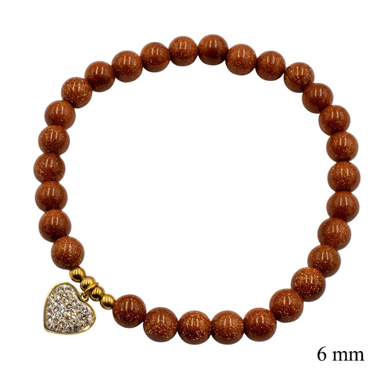 Elegancka bransoletka wykonana z drobnych koralików w odcieniu ciepłego brązu, o charakterystycznym, subtelnie mieniącym się efekcie przypominającym złoty piasek (goldstone). Całość dopełnia urocza zawieszka w kształcie serca, wysadzana drobnymi cyrkoniami, która dodaje biżuterii blasku i romantycznego charakteru.