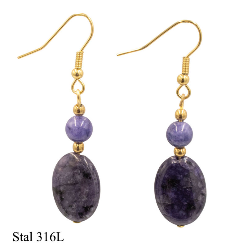 Eleganckie kolczyki wykonane ze stali chirurgicznej 316L w złotym kolorze, ozdobione naturalnym kamieniem w odcieniach fioletu – ametystem. Połączenie kulistego koralika z większą, owalną formą nadaje biżuterii harmonijny i stylowy wygląd.