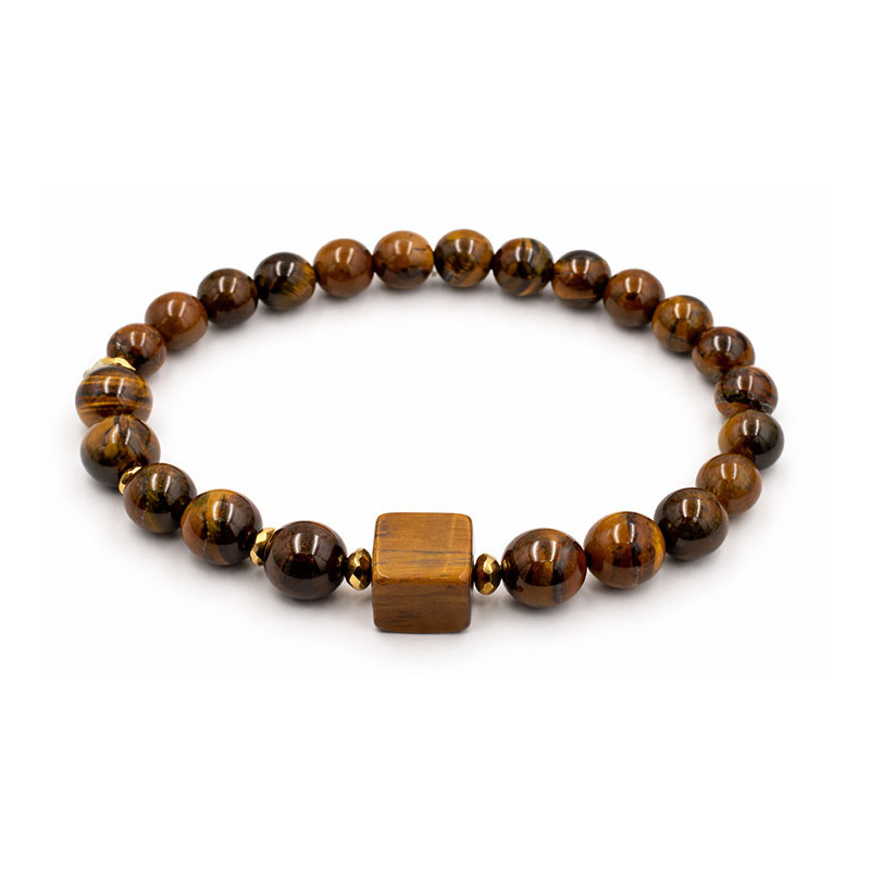 Stylowa bransoletka wykonana z naturalnego kamienia tygrysie oko, znanego z charakterystycznych, złoto-brązowych refleksów i niepowtarzalnego rysunku. Centralnym elementem jest geometryczna kostka, która nadaje całości nowoczesnego i wyrazistego charakteru.
