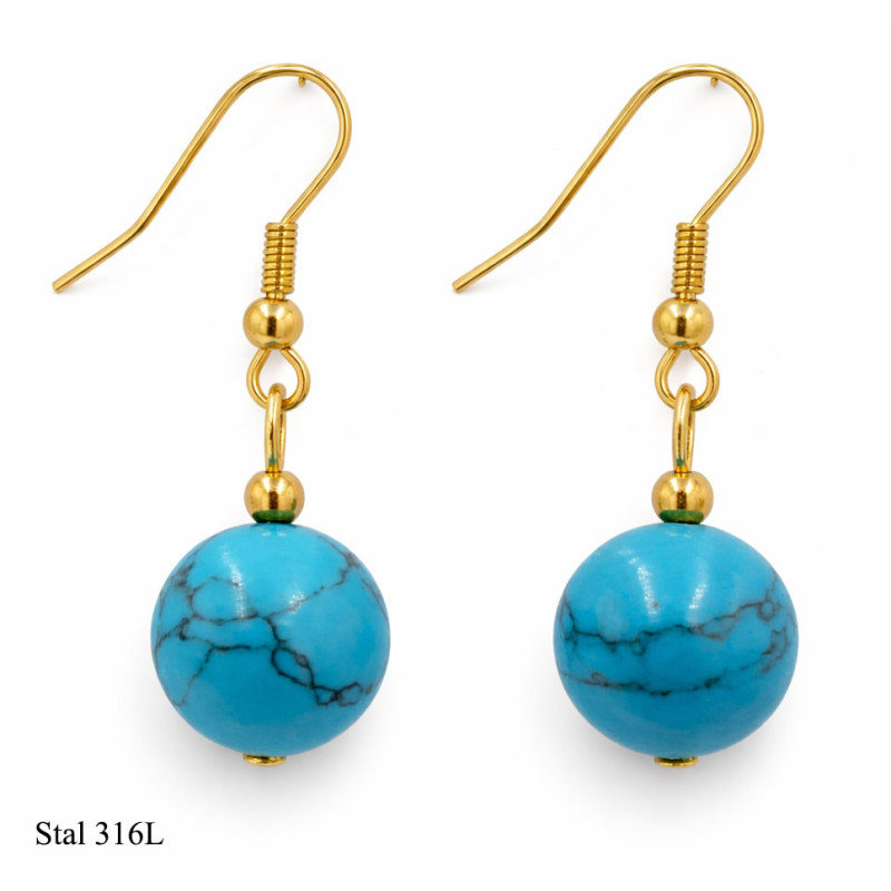 Wyraziste kolczyki wykonane ze stali chirurgicznej 316L w złotym kolorze, ozdobione kulistym kamieniem w odcieniu turkusu. Charakterystyczne, naturalne żyłkowania nadają każdej parze unikalnego wyglądu i podkreślają ich wyjątkowy charakter.