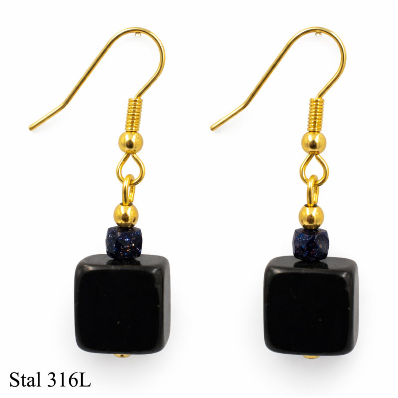 Stylowe kolczyki wykonane ze stali chirurgicznej 316L w złotym kolorze, ozdobione geometryczną kostką w głębokiej czerni oraz drobnym, mieniącym się koralikiem typu goldstone w odcieniu granatowym.