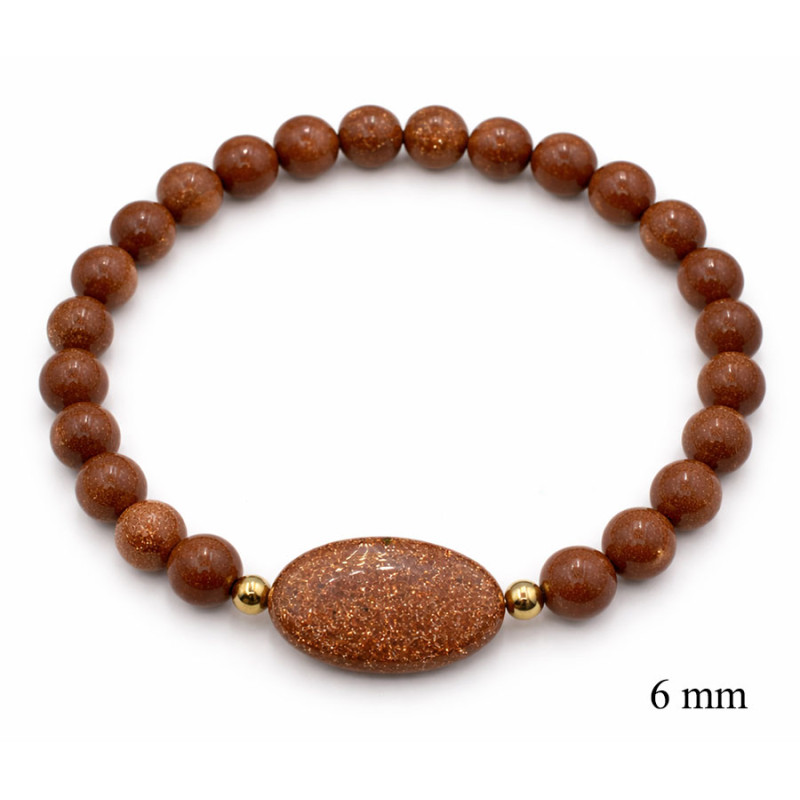 Elegancka bransoletka wykonana z drobnych koralików typu goldstone (złoty piasek), które subtelnie mienią się drobnymi refleksami. Centralnym elementem jest większy, owalny kamień, nadający całości wyjątkowego i bardziej wyrazistego charakteru. Złote przekładki pięknie podkreślają ciepłą kolorystykę bransoletki.