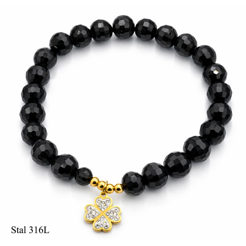 Elegancka bransoletka wykonana z fasetowanych, czarnych koralików, które pięknie odbijają światło i nadają całości subtelnego blasku. Ozdobą jest zawieszka w kształcie czterolistnej koniczyny, wysadzana drobnymi cyrkoniami – symbol szczęścia i pozytywnej energii.