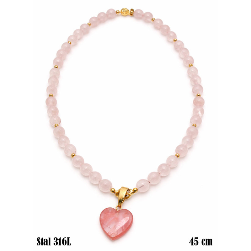 Romantyczny i subtelny naszyjnik wykonany z naturalnego kwarcu różowego, który symbolizuje miłość, delikatność i harmonię. Centralnym elementem jest urocza zawieszka w kształcie serca w intensywniejszym odcieniu różu, która nadaje całości wyjątkowego charakteru.
