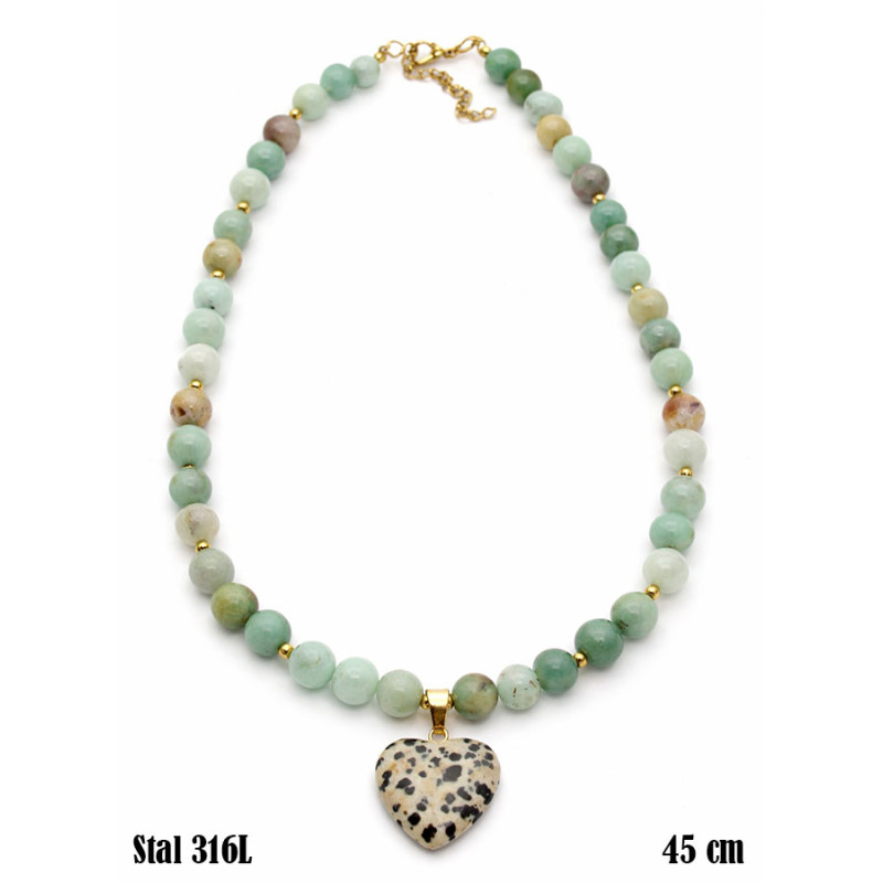 Naturalny i wyjątkowy naszyjnik wykonany z koralików amazonitu w delikatnych odcieniach zieleni, przełamanych subtelnymi, naturalnymi przebarwieniami. Centralnym elementem jest zawieszka w kształcie serca o charakterystycznym, nakrapianym wzorze, która nadaje całości oryginalności i wyrazistości.